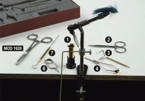 Contenido: Morsa de mesa, Tijera, Porta Bobina, Pinza de hackle, Anudador, Enhebrado, Emparejador de pelo, Punzón